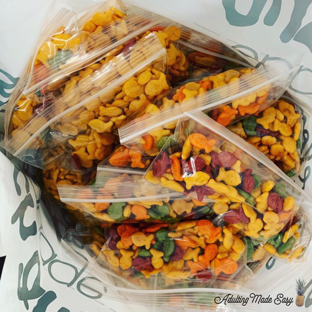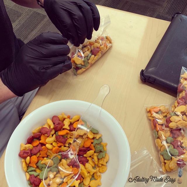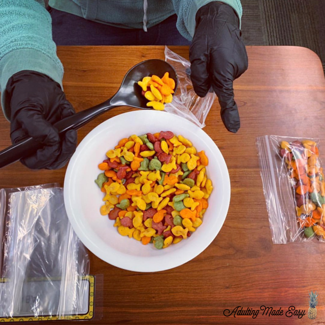 - I gave each student their own packing station providing them with gloves, a bowl of goldfish, a box of zip locks, and a serving spoon.
