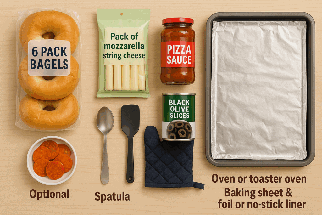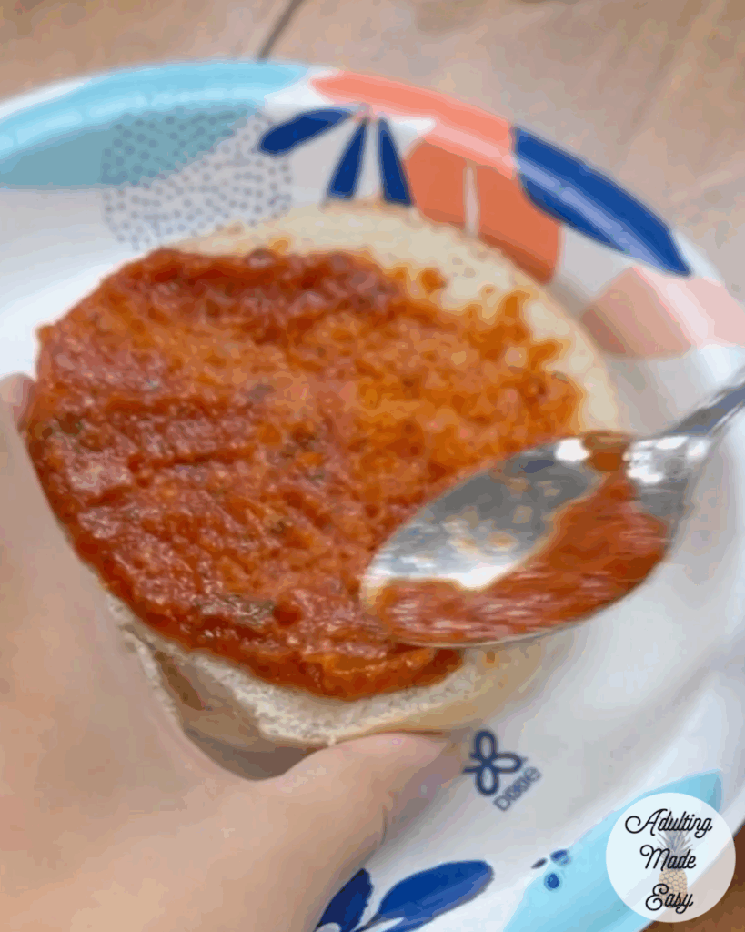 - 🍅 Spoon some pizza sauce onto each bagel half and spread evenly
