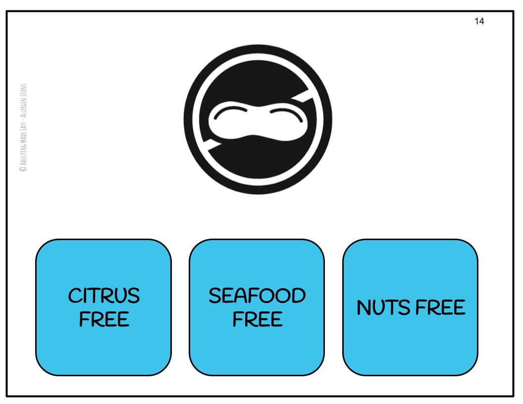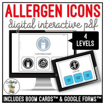 Functional reading of allergy symbols. Differentiated 4 different ways, helping students to recognize common allergy icons commonly found on food packages for safety with immediate positive reinforcement for correct answers, redirection for incorrect answers.; NO PREP, PAPERLESS Distance or Remote Learning