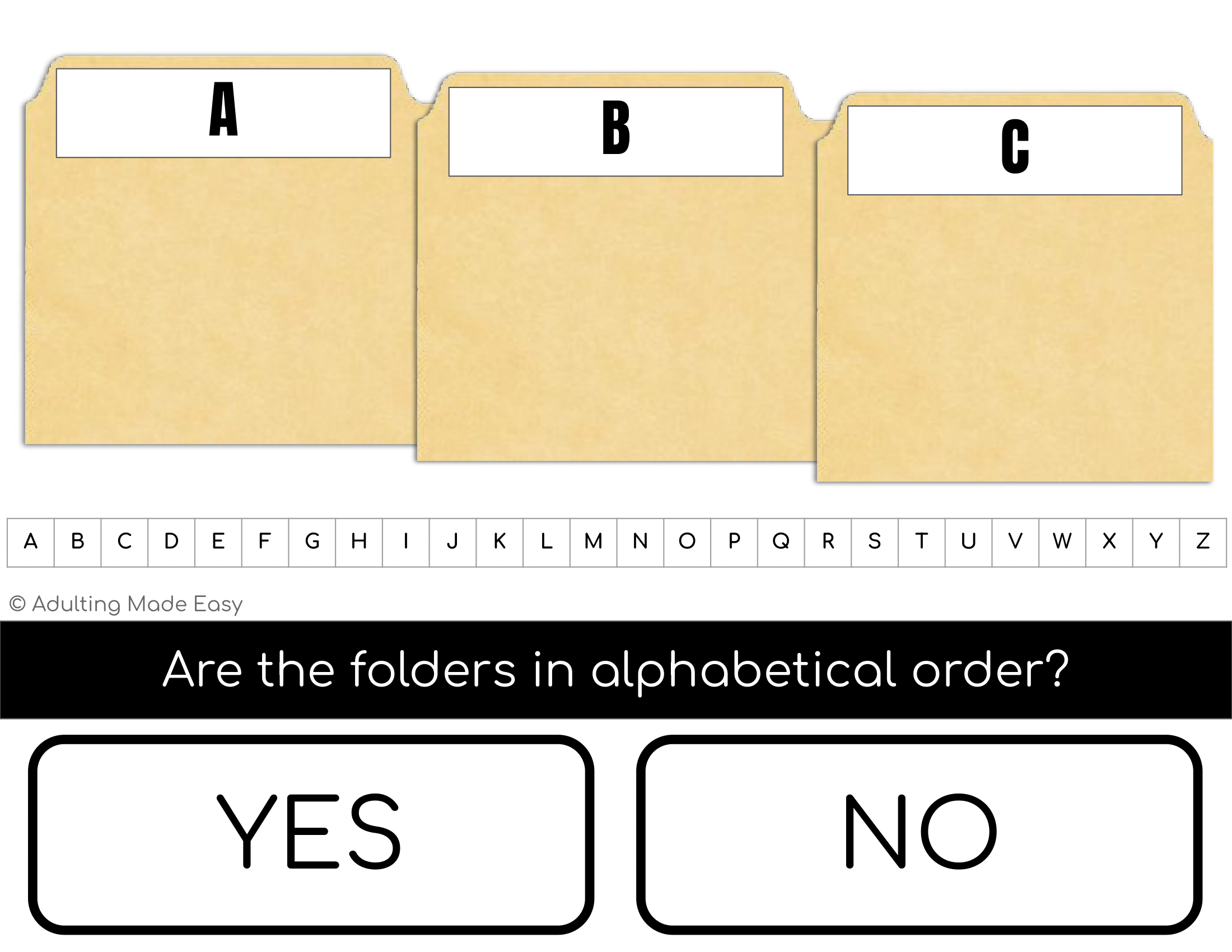 The student is given 3 file folders labeled with letters. They will determine if the folders are in alphabetical order from left to right. Essential job skill for filing papers This activity is great for special education students