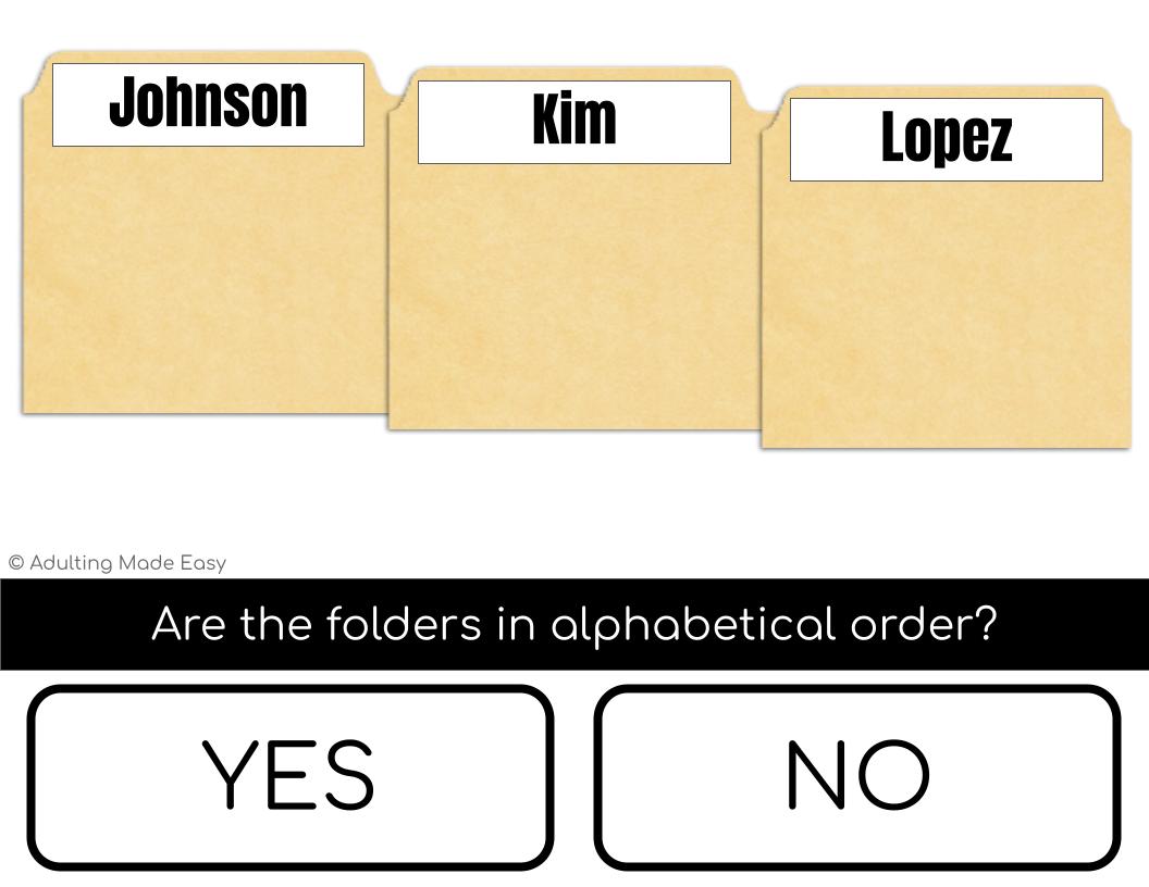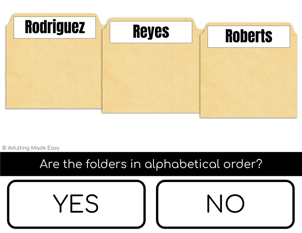 The student is given 3 file folders labeled with last names. They will determine if the folders are in alphabetical order from left to right according to the word. Essential job skill for filing papers NO PREP, PAPERLESS. Distance or remote learning