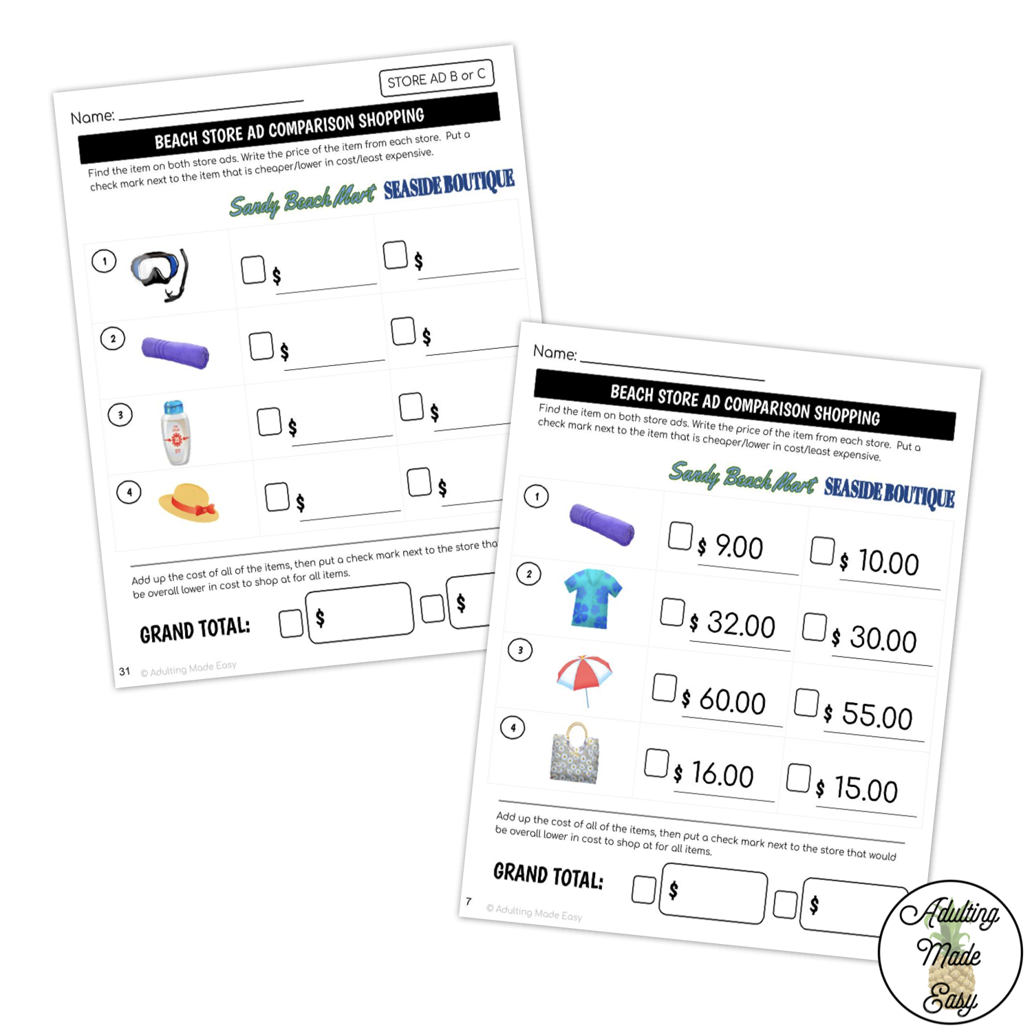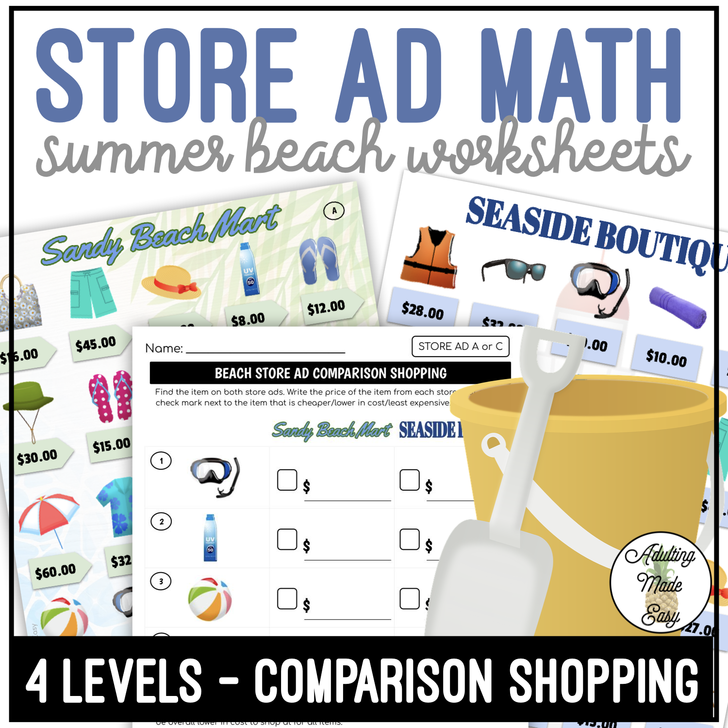 Functional & differentiated life skills comparison shopping and addition problems using simplified store ads with the same items (in different spots) for easy comparing between stores with beach supplies. Students will compare each item to determine where it costs less, add the grand total and compare the total shopping trip prices.