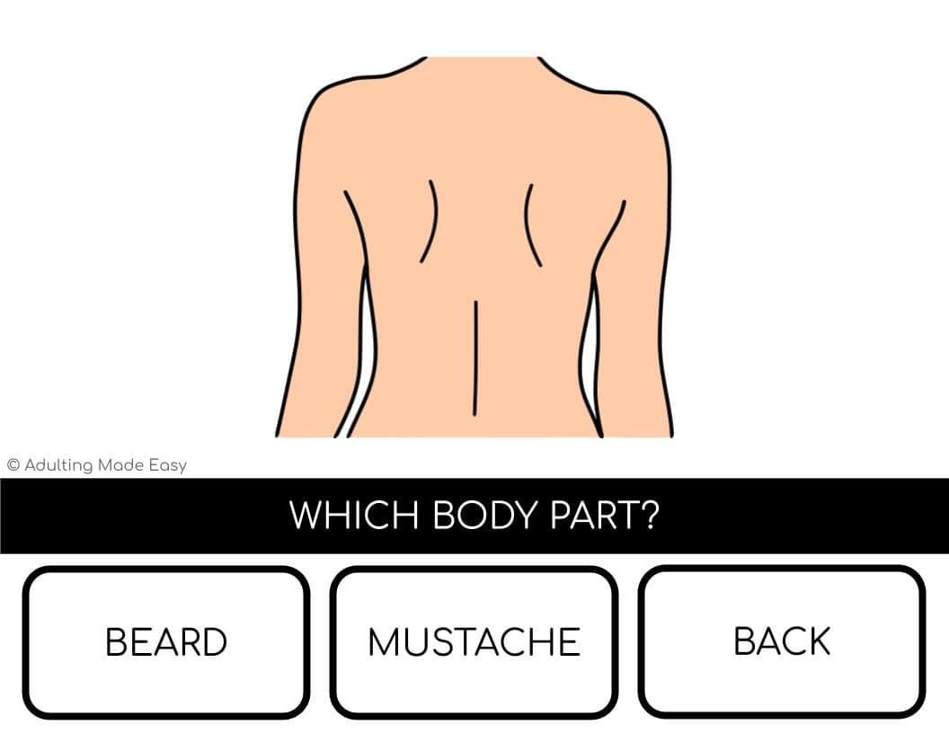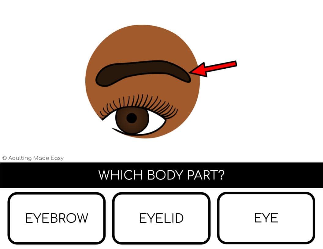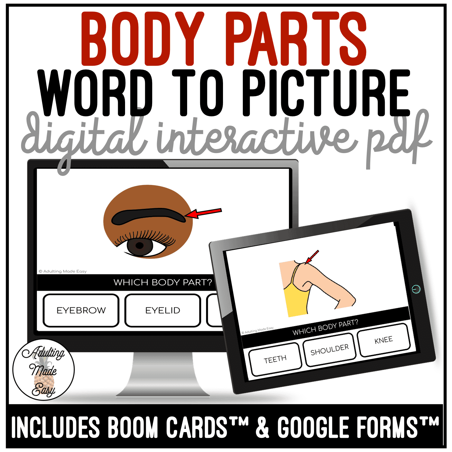 An essential life skill is to identify body parts. This skill will help individuals communicate if something hurts, clothing to buy and so on. Student will choose the correct word after viewing the visual. Great activity for special education or English language learners. NO PREP, PAPERLESS, differentiated digital interactive activities with a field of 3 answer choices