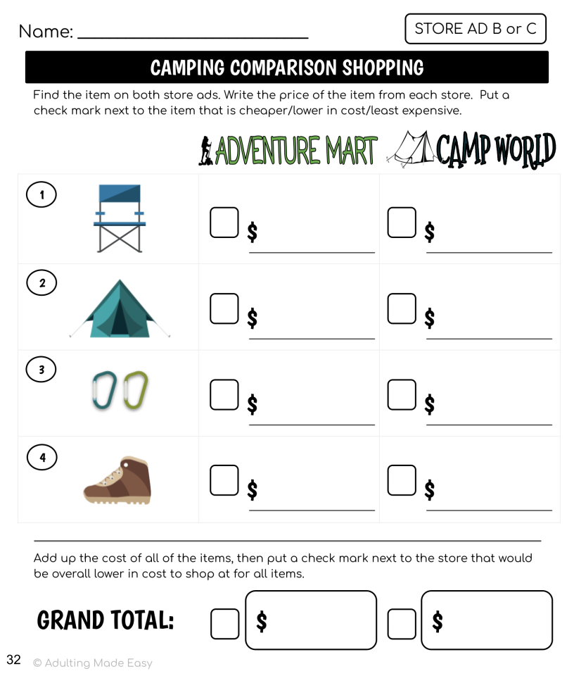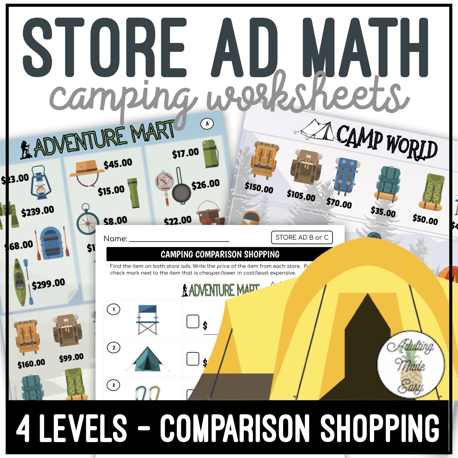 Functional & differentiated life skills comparison shopping and addition problems using simplified store ads with the same items (in different spots) for easy comparing between stores with camping, outdoor adventure & hiking gear. Students will compare each item to determine where it costs less, add the grand total and compare the total shopping trip prices.