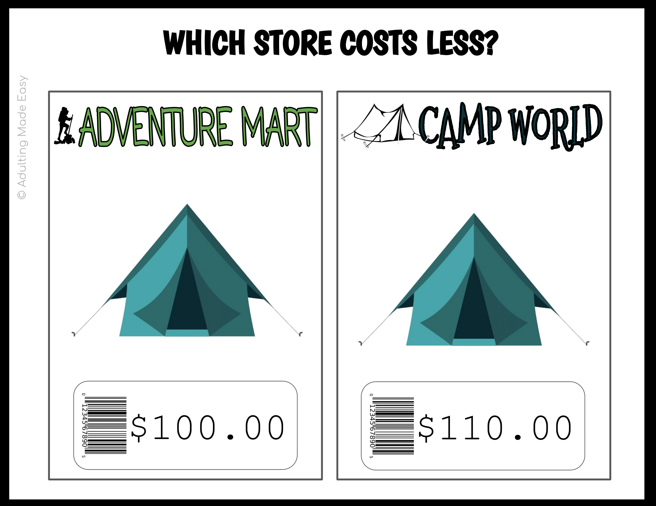 - Student is to determine which fictitious department store is selling the item cheaper (for less).
