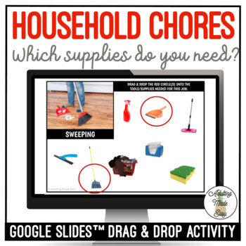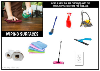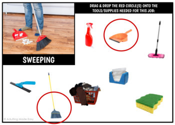 - Student will drag & drop the red circle on the item(s) needed for the chore, within a few visual choices.