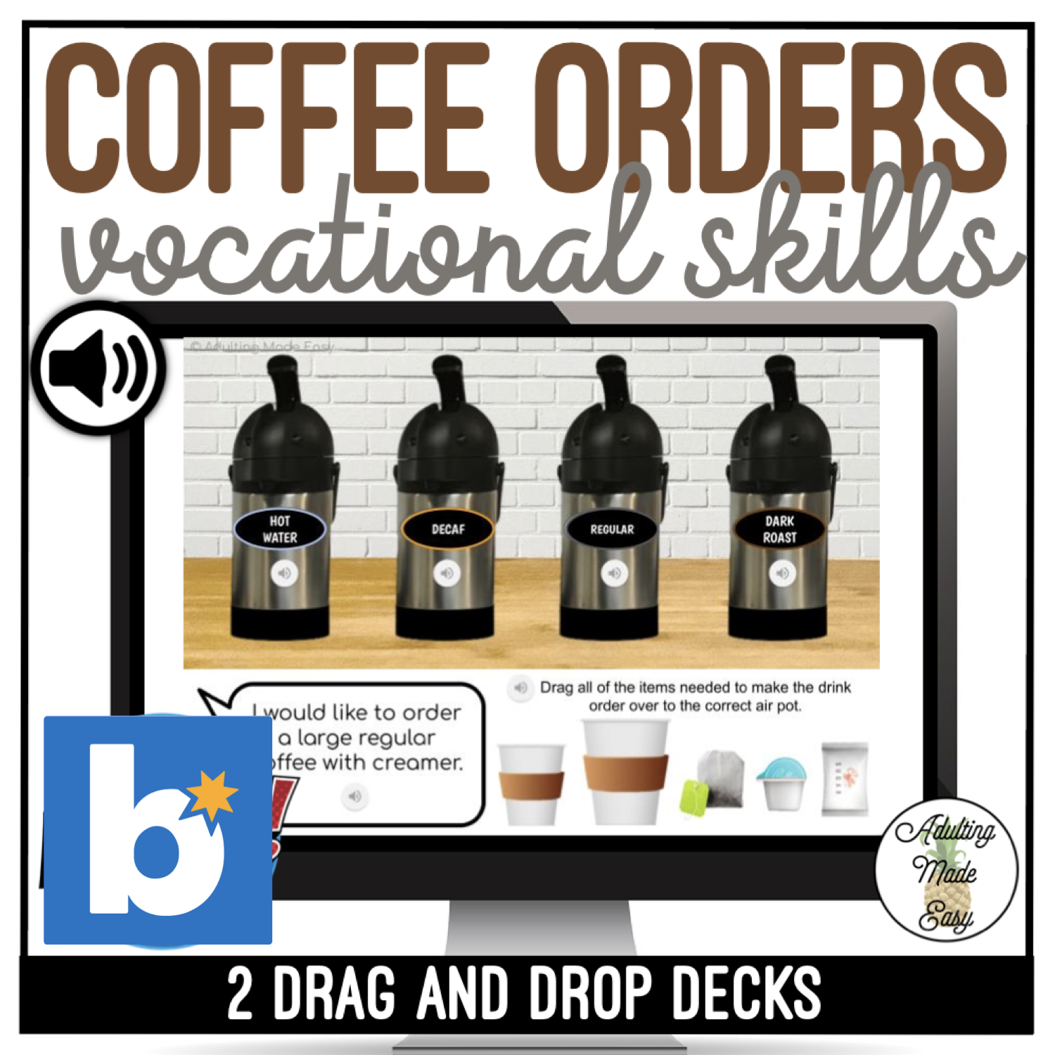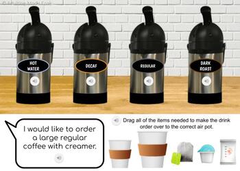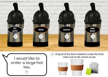 Differentiated digital task box activity – Coffee cart themed activity to practice fulfilling hot drink orders in place of on campus jobs! Features air pot coffee dispensers with hot water, decaf, regular and dark roast coffee, small and large coffee cups, tea bag, creamer, and sugar.