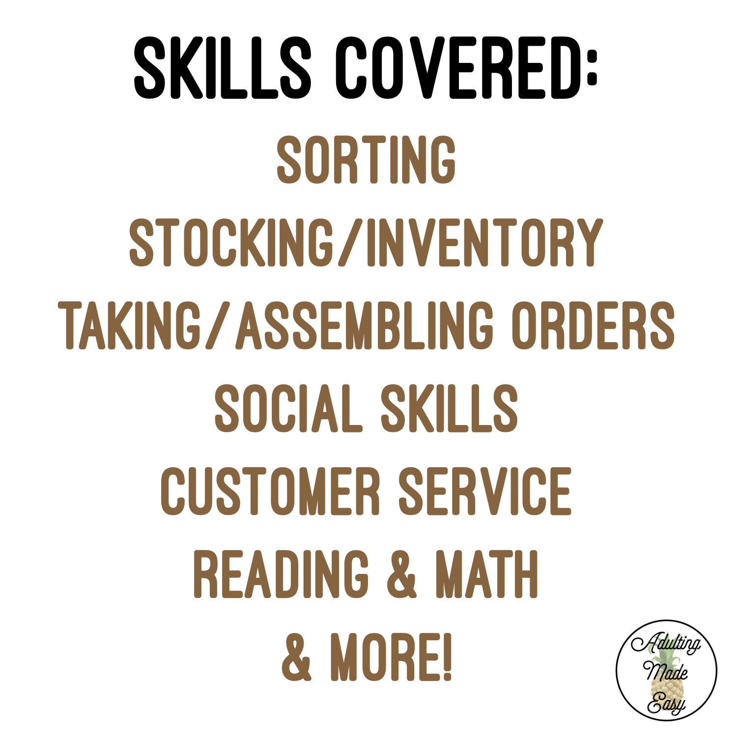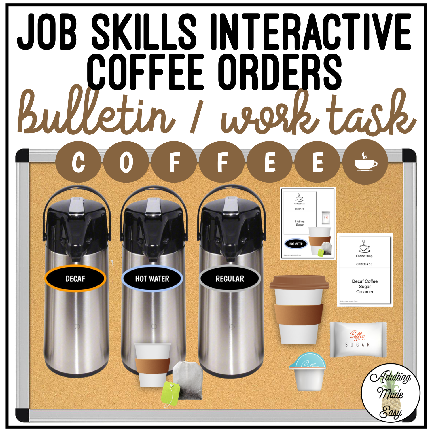 Engaging activities for hands-on life skills & job skills that can be done on the board for a group lesson, or independent task box for special education! Learn basic vocational skills like assembling drink orders and customer service before going to an off-campus job, or an age-appropriate way to practice skills that you would need on a CBI community outing.