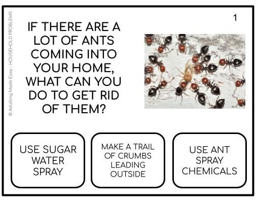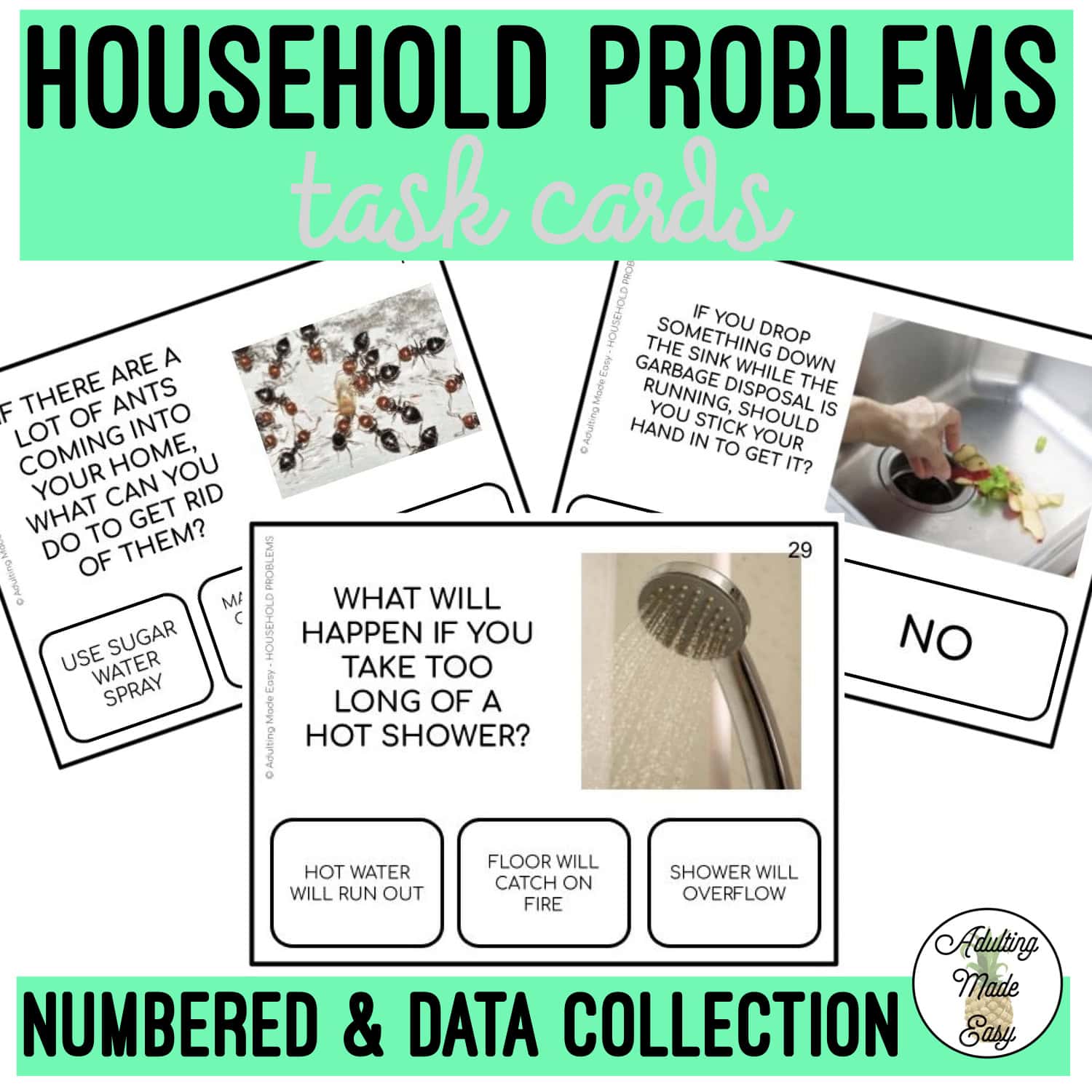 40 task cards on common household problems. Makes a great discussion starter on how to problem solve or prevent damages from occurring. Discusses topics like insect infestations, safety, water damage, leaks, clogs, power outage, toilets, sinks, washer & dryer…etc.