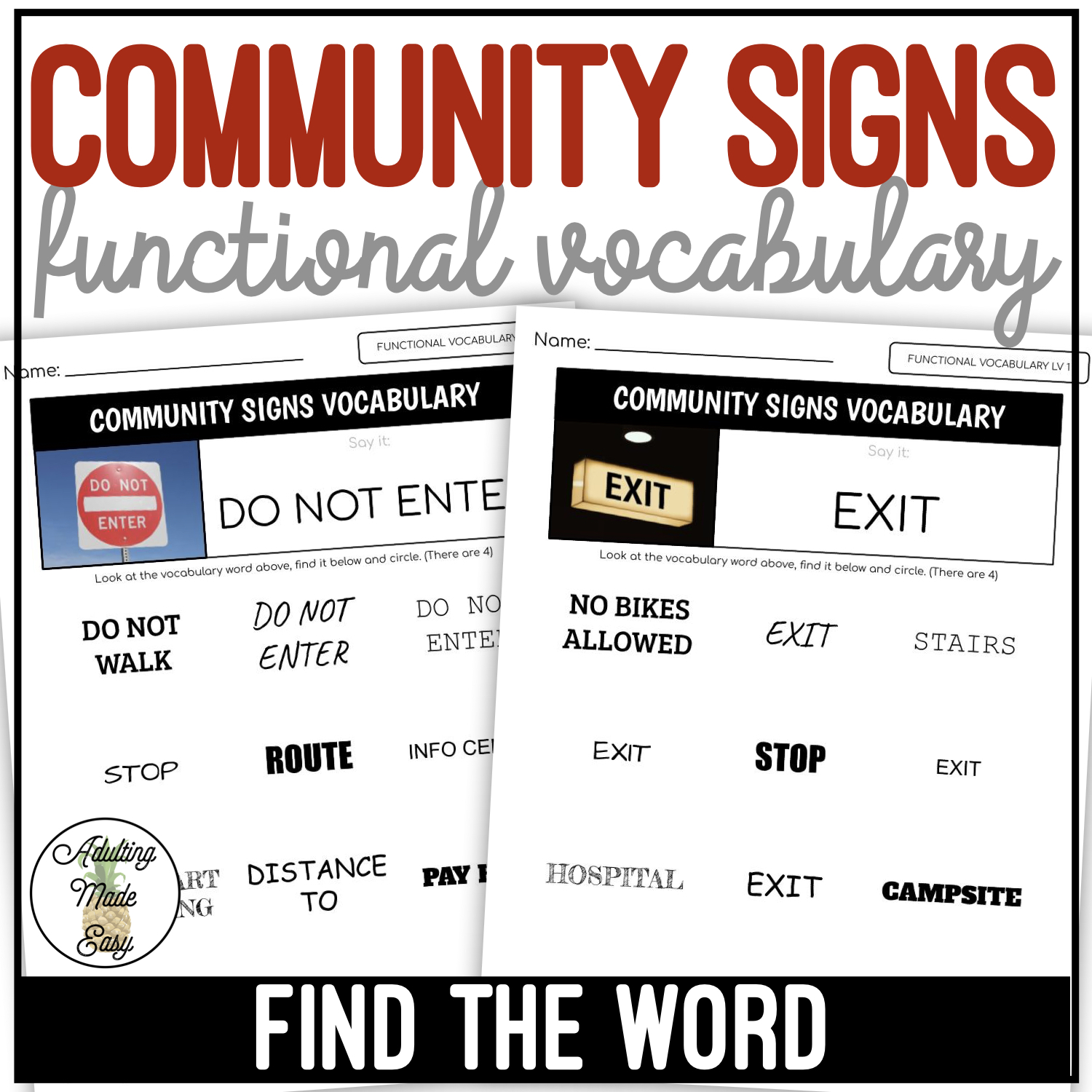Vocabulary featured: escalator, railroad crossing, stop, dead end, under construction, subway station, do not enter, no bikes allowed, pedestrian crossing, crosswalk ahead, hiking trail, elevator, route, one way, detour, road work ahead, airport, bike lane, golf cart crossing, equestrian crossing, reserved for disabled, pay here, exit, emergency exit, hotel ahead, watch for animals, street sign, restrooms, men’s restroom, women’s restroom, gas station, campsite, hospital, bus stop, park and ride, no trespassing, restaurants ahead, school bus stop, emergency phone, crosswalk button, info center, stairs, distance to, no food or drink, do not walk, walk, wifi available.