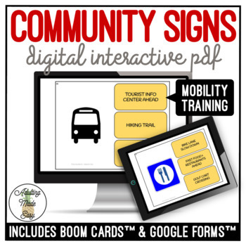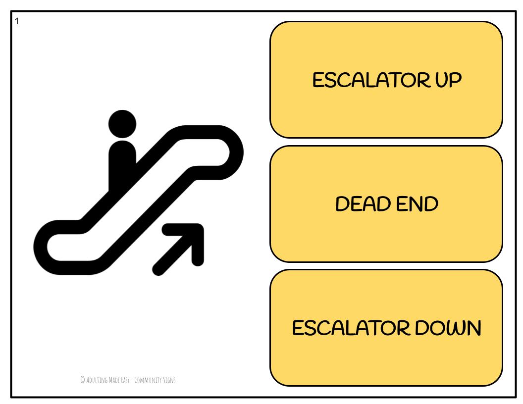 Community access & functional reading for special education students. Unlike most community signs resources, this resource is geared towards students that may not drive, and instead travel around the community by walking, using public transportation, carpooling… and so on. A majority of signs included in this resource are road signs, but only those that would be important for non-drivers to know for safety and getting to and from places. Immediate positive reinforcement for correct answers, redirection for incorrect answers.; NO PREP, PAPERLESS. Distance or Remote Learning