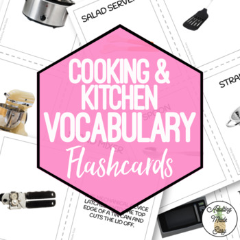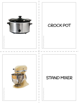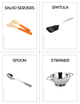 Vocabulary featured: blender, bread knife, carving knife, chefs knife, crock pot, stand mixer, barbeque fork, fork, frying pan, grater, griddle pan, hand blender, handheld mixer, ice cream scoop, kettle, butter knife, ladle, measuring spoons, meat cleaver, oven glove, oven, stock pot, saucepan, peeler, salt & pepper shakers, measuring cup, potato masher, salad bowl, salad servers, spatula, spoon, strainer, can opener, microwave, cupcake pan, baking sheet, apron, recipe book, measuring cups, charcoal grill, BBQ utensils, sieve, gas grill, weighing scale, hood vent, toaster, pressure cooker, baking spatula, mixing bowl, cooking oil, mug, ice tray, cup, pitcher, refrigerator, cabinet, freezer, kitchen, sink, place setting, napkins, wine glass, pizza cutter, rolling pin, toaster oven, rice cooker, bottle opener, Bundt pan, wok, coffee maker, cutting board, whisk, pasta ladle, tea cup, wine bottle opener, lid.