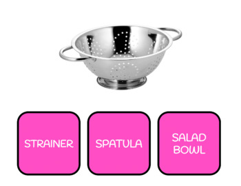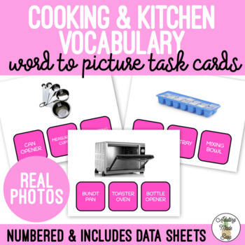 Students practice sight word recognition and functional reading with real-photo vocabulary cards focused on cooking and kitchen supplies.