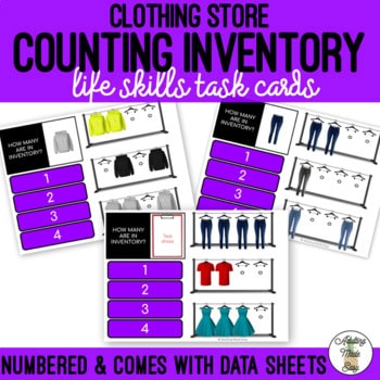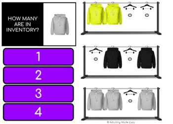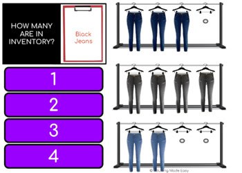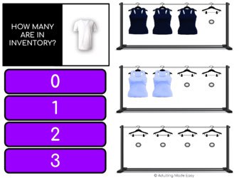 Vocational skills activity where students will count how many items are in inventory when given the visual or item written on the clipboard. Inventory values are from 0-4.
