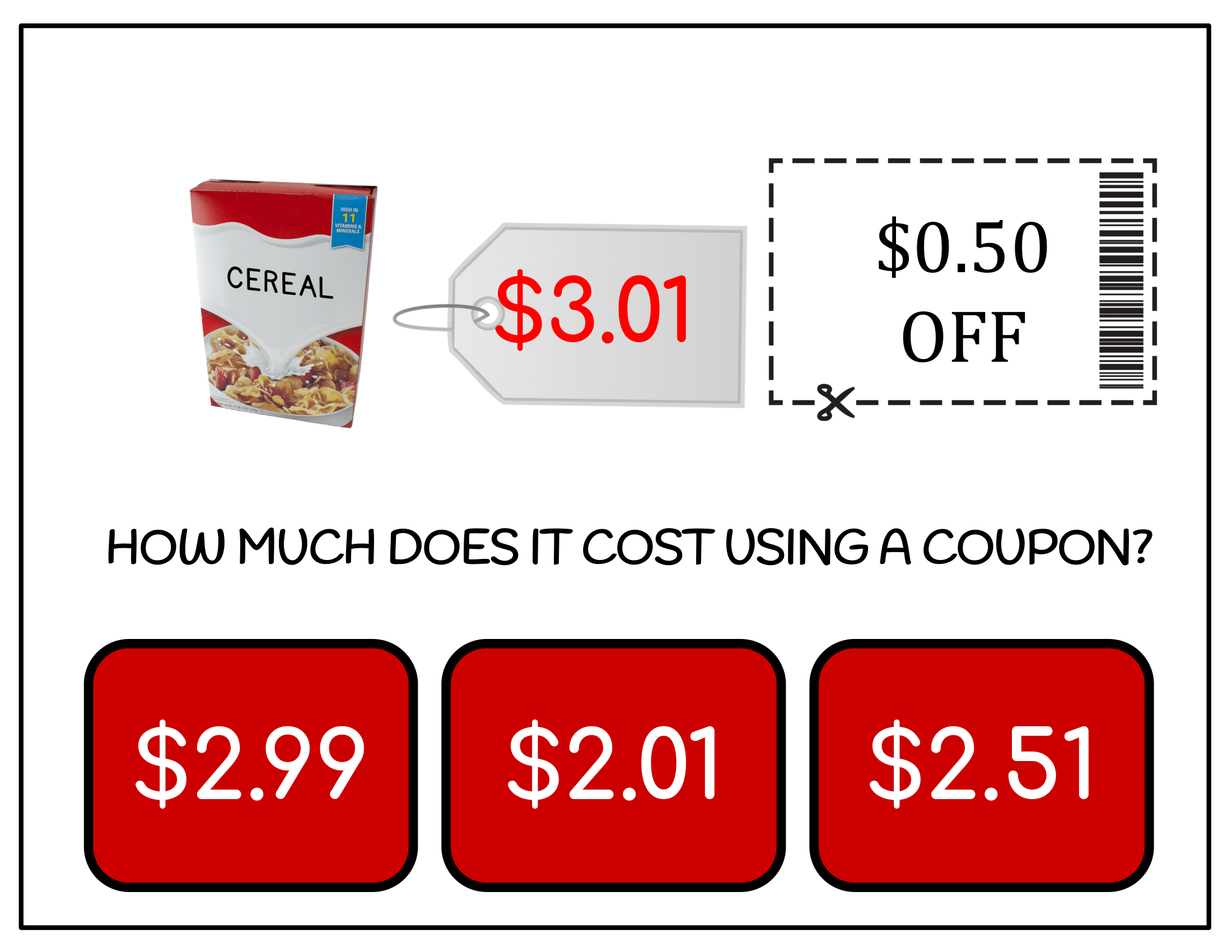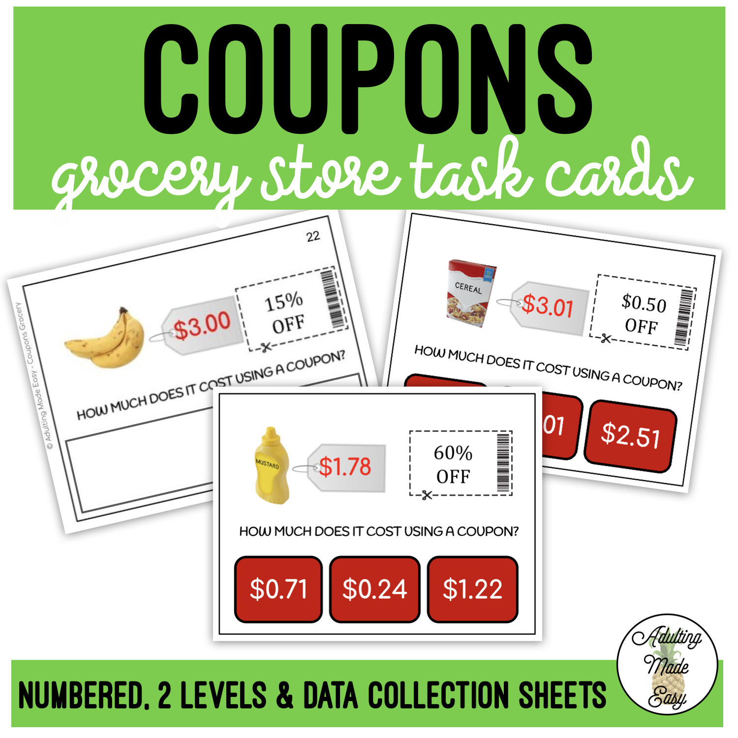 How Much Does It Cost Using Coupons? Grocery Store – age appropriate & visual money consumer math activity for special education.