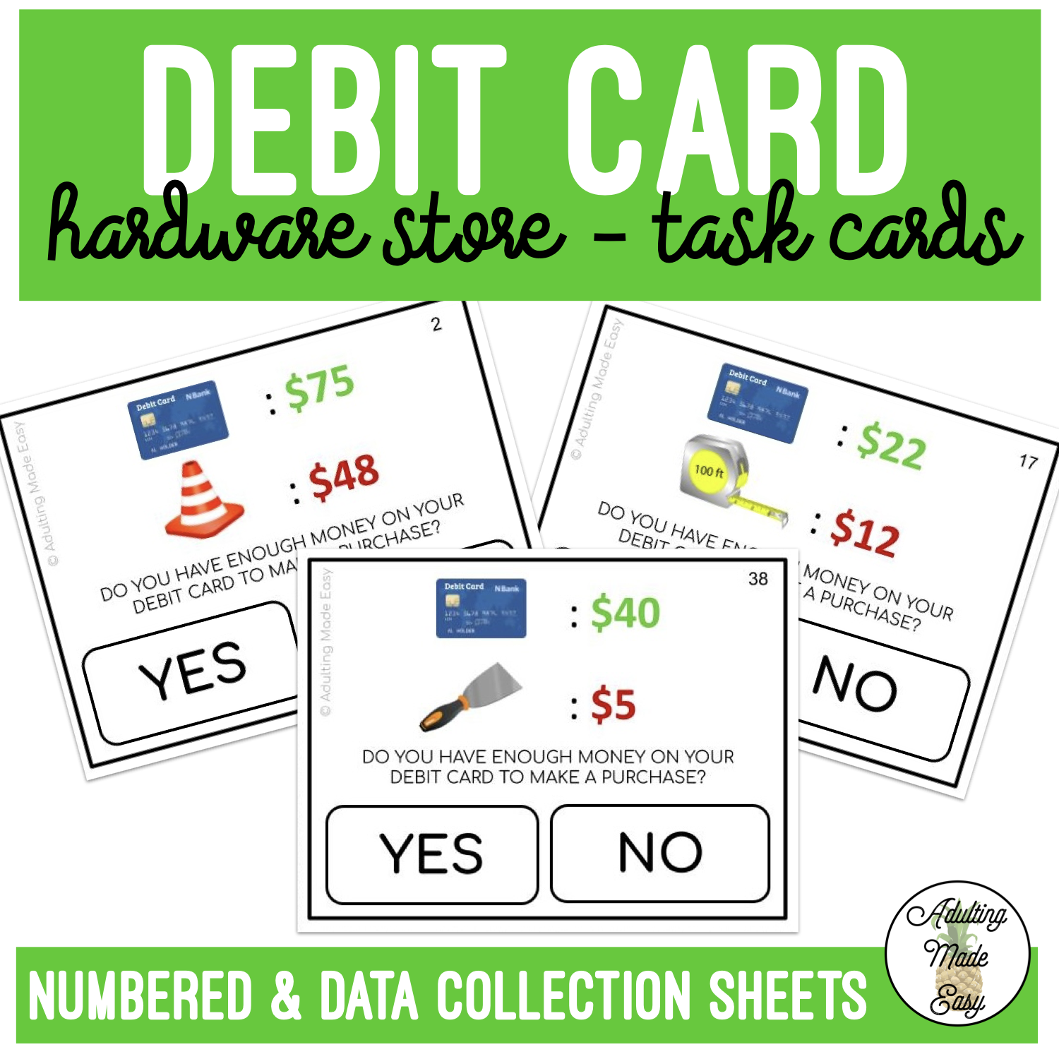Can I Use My Debit Card? Consumer math, Financial literacy Task Cards with appliances, repair tools and supplies commonly seen at a hardware store, to help students identify if they have enough money in their account to use their debit card. Great for students learning to use their debit cards appropriately and effectively.