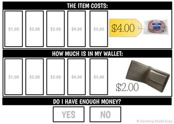 Digital Independent Work budgeting task box activity where students can practice identifying the cost of an item, how much they have in their wallet and if they have enough to purchase that item. Up to $5.00 in US Currency