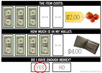 - 25 Slides Total – Student will drag and drop dollar bills according to the cost and how much is in the wallet, then drag and drop the red circle to determine if they have enough in their wallet.