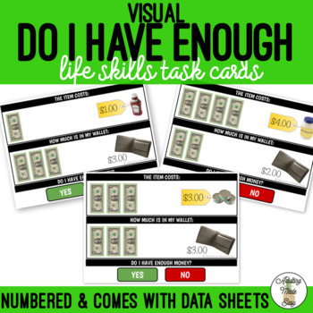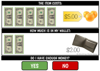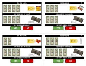 Budgeting. Students will look at the cost of an item, how much they have in their wallet and then determine (by choosing YES or NO) if they have enough to purchase that item. This activity contains US Currency dollar bills Up to $5.00 for the cost of the item/wallet and is visually set up to help the student compare the two values.