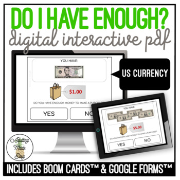 Visual and Functional life skills budgeting activity for special education and autism. The student will look at how much money they have (US CURRENCY) and compare it to the shopping bag price tag to determine if they have enough money to make a purchase. NO PREP, PAPERLESS. Distance or remote learning consumer math financial literacy