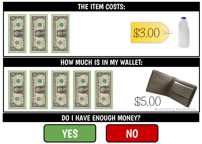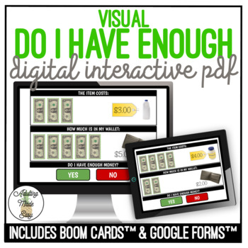 Visual and Functional life skills budgeting activity for special education and autism. Students will look at the cost of an item, how much they have in their wallet and then determine (by choosing YES or NO) if they have enough to purchase that item. This activity contains US Currency dollar bills Up to $5.00 for the cost of the item/wallet and is visually set up to help the student compare the two values. NO PREP, PAPERLESS. Distance or remote learning consumer math financial literacy