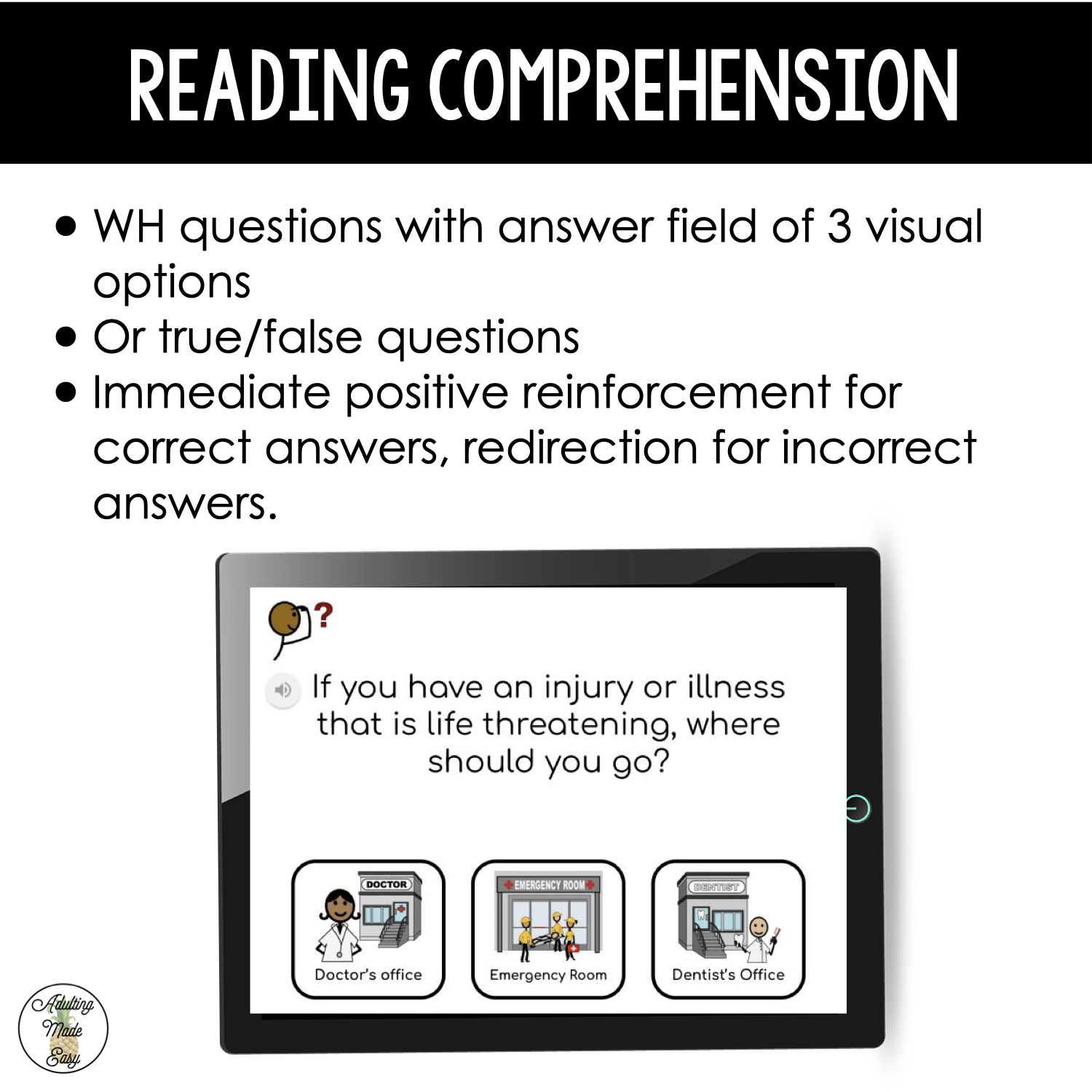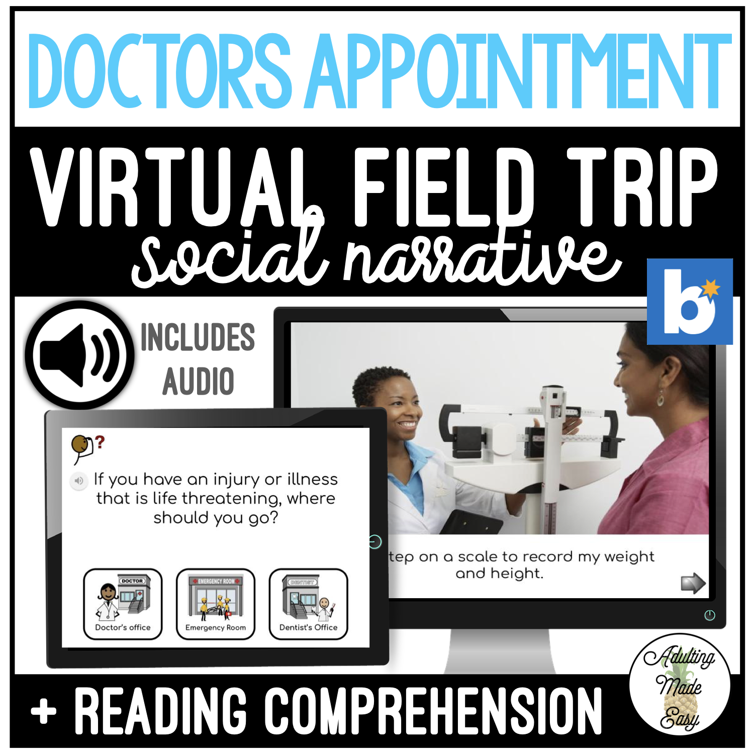 A virtual field trip or community-based instruction narrated as a social story. Help ease the uncertainty and prepare your students with direct social skills instruction that is beneficial to students with special needs or autism. Discusses how and why to book an appointment, the emergency room, checking in, physical examination with the nurse, doctors tools, and more.