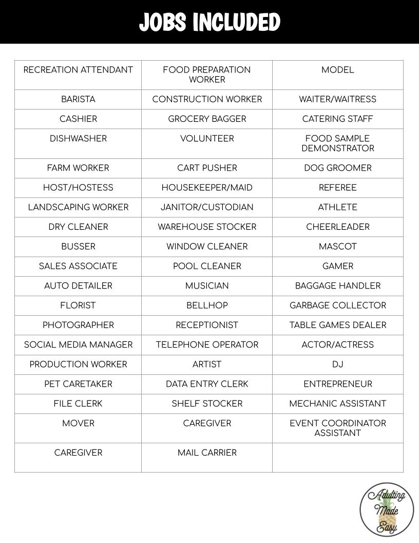 Positions included: recreation attendant, barista, cashier, dishwasher, farm worker, host/hostess, landscaping worker, dry cleaner, busser, sales associate, auto detailer, florist, photographer, social media manager, production worker, pet caretaker, file clerk, food preparation worker, construction worker, grocery bagger, volunteer, cart pusher, housekeeper/maid, janitor/custodian, warehouse stocker, window cleaner, pool cleaner, musician, bellhop, receptionist, telephone operator, artist, data entry clerk, shelf stocker, model, waiter/waitress, catering staff, food sample demonstrator, dog groomer, referee, athlete, cheerleader, mascot, gamer, baggage handler, garbage collector, table games dealer, actor/actress, dj, entrepreneur, mechanic assistant, event coordinator assistant, mover, caregiver, video content creator (“You Tuber”).