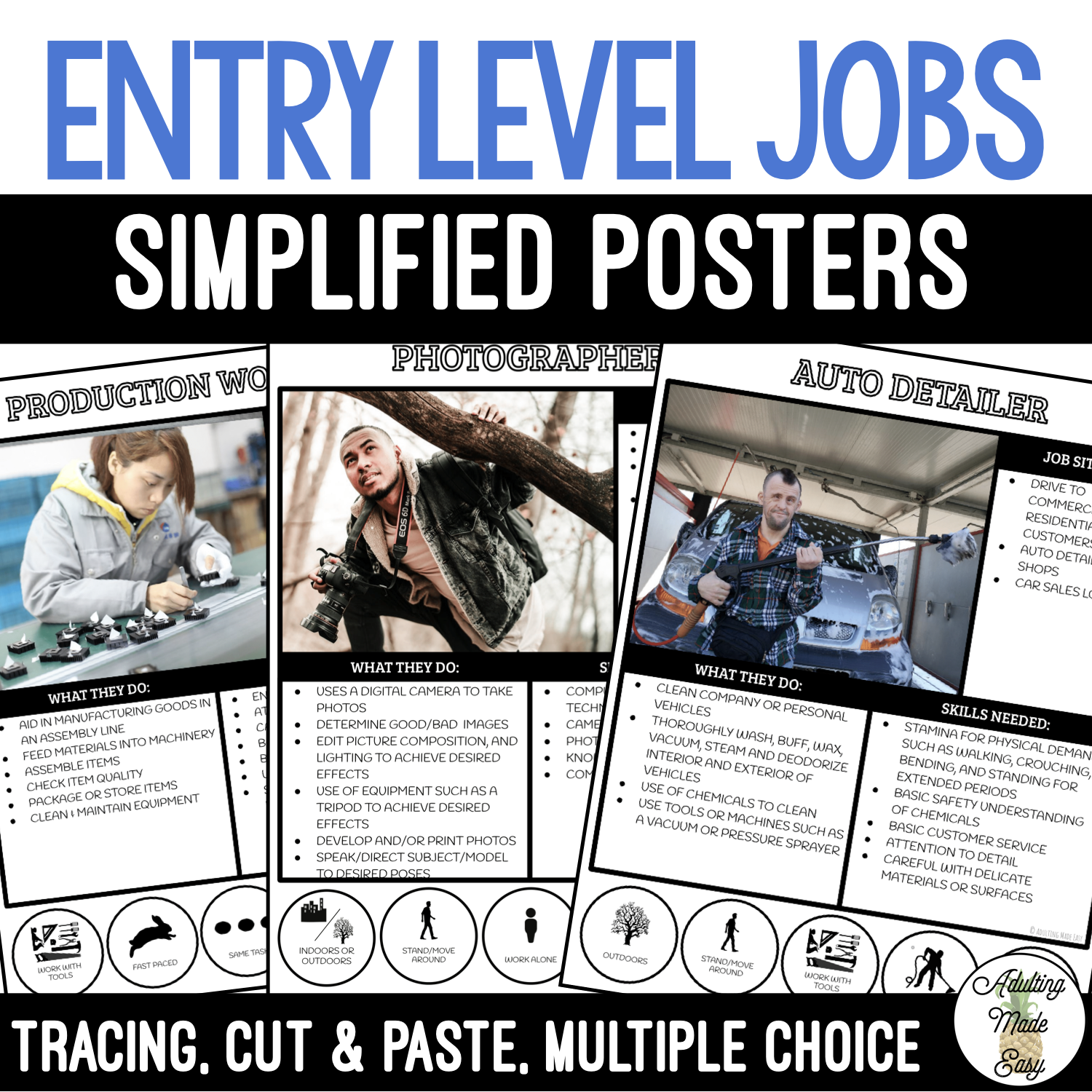 • This activity intends to introduce different entry-level job options for students who may have no experience or may possibly not graduate with a diploma.