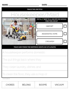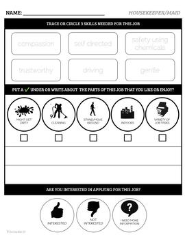 Simplified reading comprehension questions highlighting job sites, what they do, skills needed, preferences and job interest. These are great for special education students looking to explore career interest options. The pictures depict individuals of different genders, ethnicities, and with disabilities!