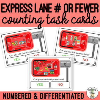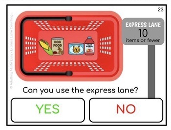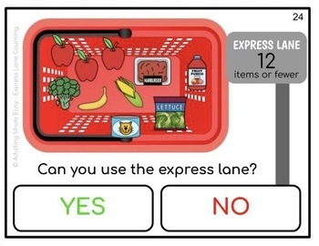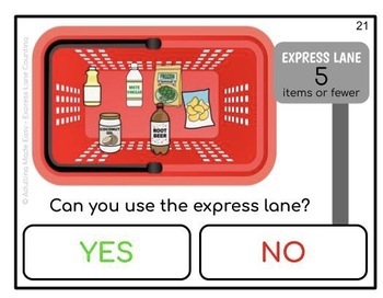 Visual and Functional life skills activity for special education and autism. The student is to count the number of items in the shopping basket and determine if they can use the express lane (# or fewer) at the grocery store.