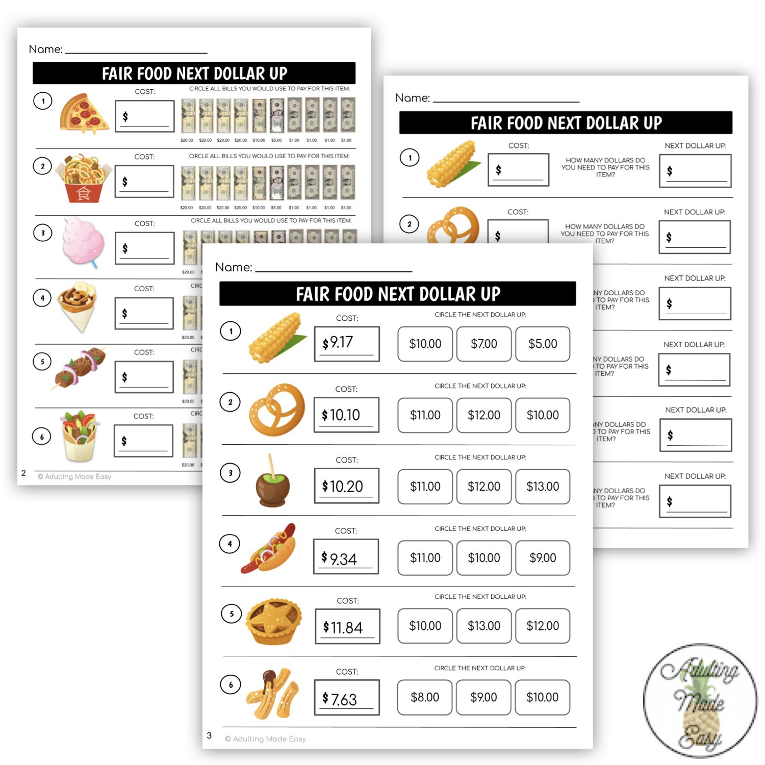 Simplified Functional & differentiated life skills next dollar over method using visual priced menus. Worksheets that coordinate with a few different menus that students will look up the price then determine how much money they need to purchase the item.