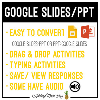 - Drag & Drop Google Slides™ activity. From there you can move around or delete pages depending on your students’ needs. (If you need this activity in PowerPoint, Google Slides allows you to easily convert to a PPT file!)