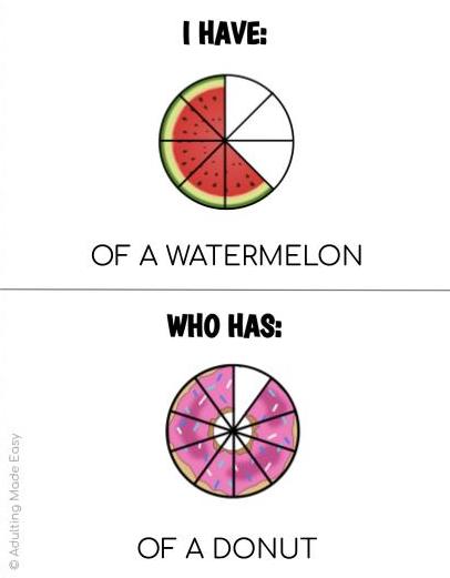 How to play: The person with the starter card asks their “who has…” question (eg. Who has 1/2 of a cookie”. The student with the correct answer says “I have!” and then asks the “who has…” question that is on their card.