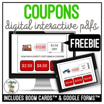 How Much Does It Cost With Coupons? NO PREP, PAPERLESS, differentiated digital interactive activities that have students practice applying coupons (by %) to product purchases and calculating the price consumer math. Distance or remote learning