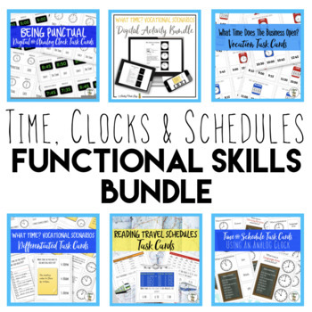 DIFFERENTIATED, VISUAL, FUNCTIONAL, AGE APPROPRIATE activities to practice reading, calculating, and problem solving with analog clocks, digital clocks, and schedules in a vocational, life skills, school, or community setting. Age appropriate functional reading activities for special education students!