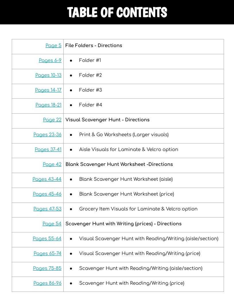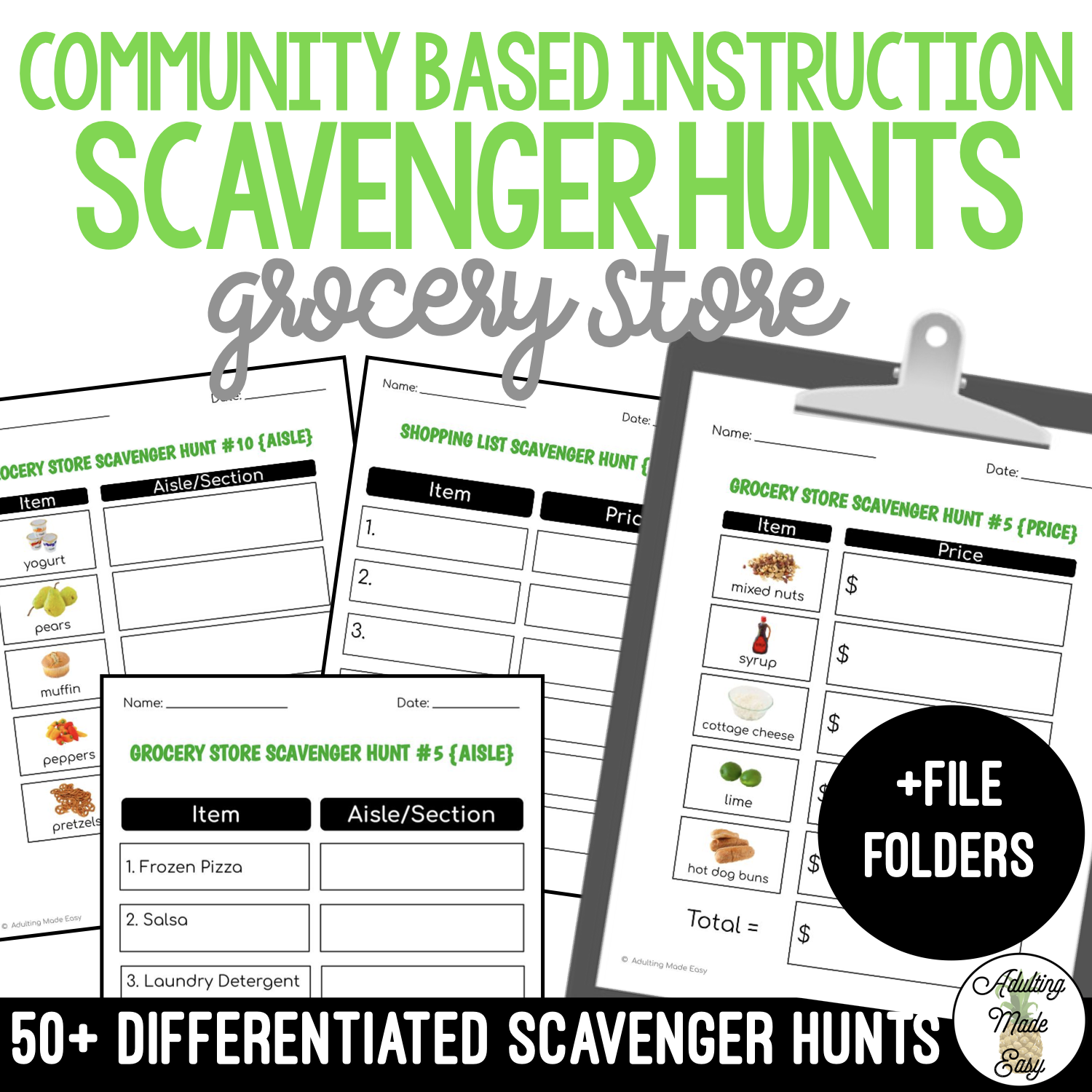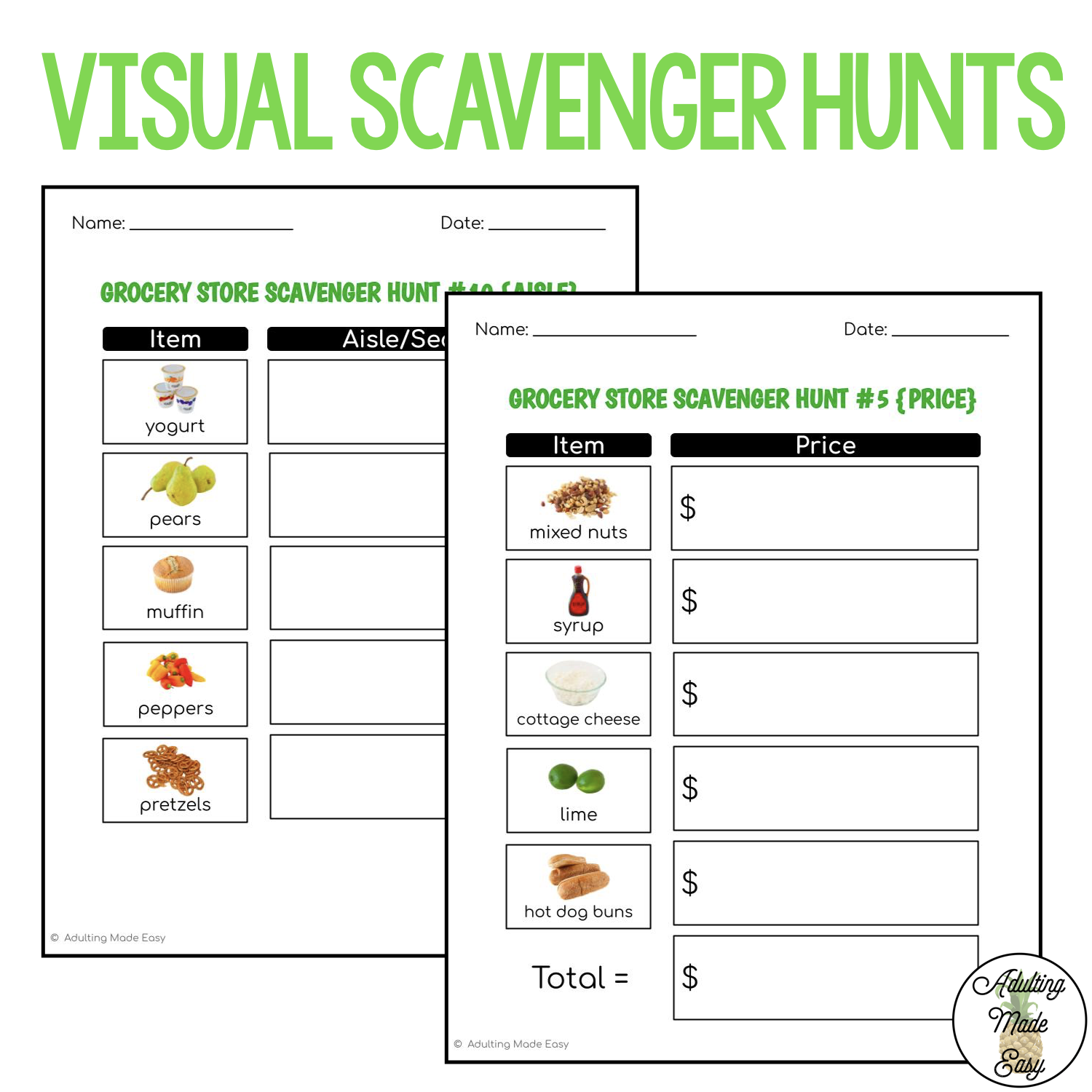 Take a trip to the store to find these common grocery store items or the prices. Non-readers can use laminated visual cards to answer which aisle an item is on, or pencil to identify aisle/section/price to complete the worksheets. Introduction to consumer math