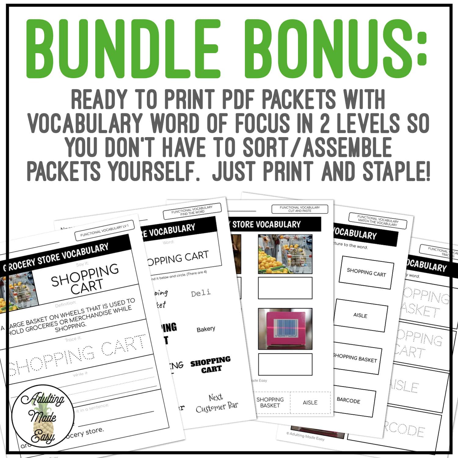 BUNDLE BONUS: Ready to print PDF packets with vocabulary word of focus in 2 levels so you don’t have to sort/assemble packets yourself. Just print and staple!