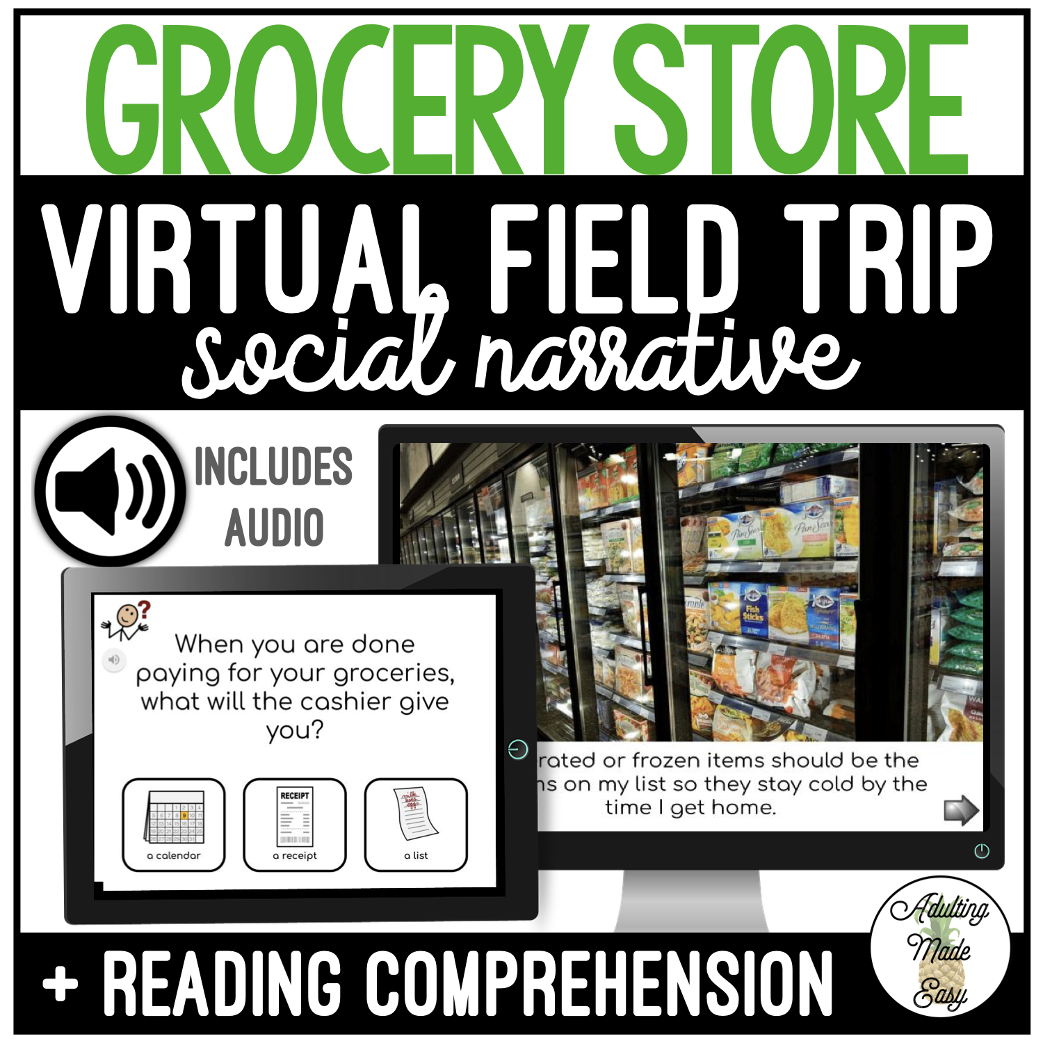 A virtual field trip narrated as a social story. Help ease the uncertainty and prepare your students with direct social skills instruction that is beneficial to students with special needs or autism. Discusses making a shopping list, getting a cart or basket, using aisle signs, weighing food, using produce bags, basic etiquette, the express lane, self-checkout, cashier, using the conveyor belt and divider, paying and waiting for change, returning the shopping cart, and more!