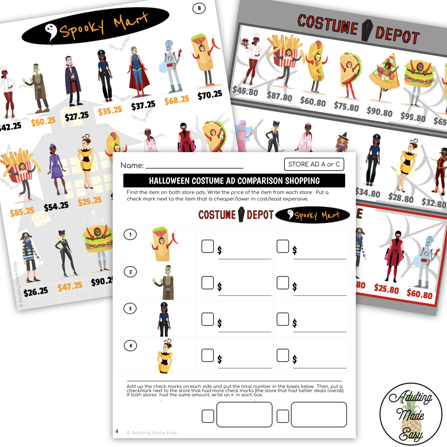 Functional & differentiated life skills comparison shopping and addition problems using simplified store ads with the same items (in different spots) for easy comparing between stores with Halloween costumes. Students will compare each item to determine where it costs less, add up which store had better deals and compare.