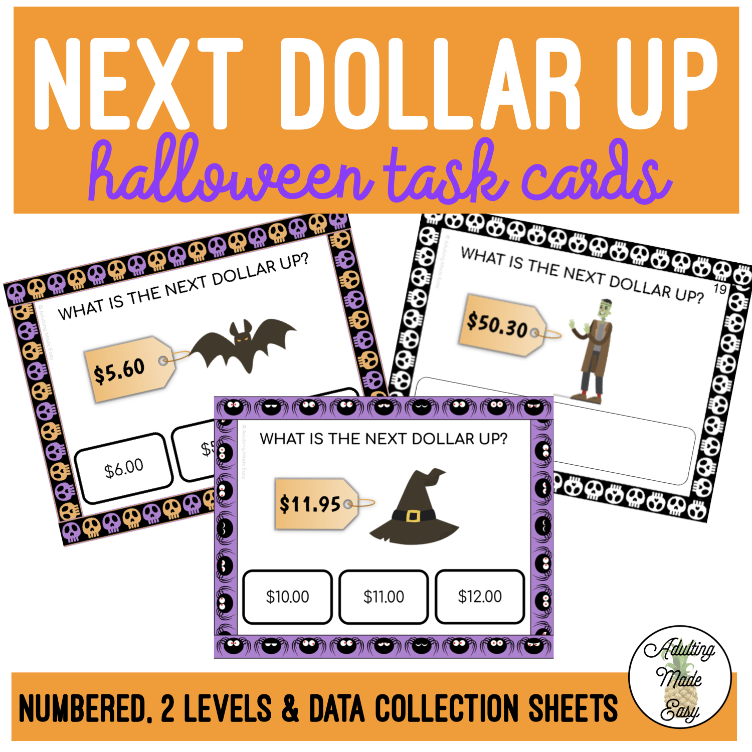 October Halloween Themed Dollar Over method Task Cards with single and double digits. Visual activity for special education that Includes clip art for costumes, pumpkins, decorations and more!