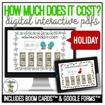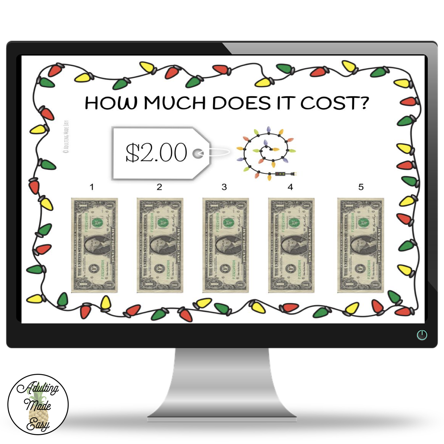 Winter & Christmas themed NO PREP, PAPERLESS functional reading money math life skills activity. Student is to determine how much an item costs using dollar bills. Great for special education or students that need touching and counting with money. Task Cards Includes gifts, candy cane, Christmas, Hanukah, Gingerbread, Ornaments, Hot cocoa, Snow flakes and more! Distance or remote learning