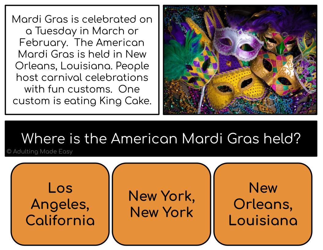 Visual and Functional life skills activity for special education and autism. Simplified holidays independent living themed passages consist of 4 short sentences each and real photos. Questions focus on WH questions among a limited field of 3 answer choices. NO PREP, PAPERLESS. Distance or remote learning