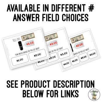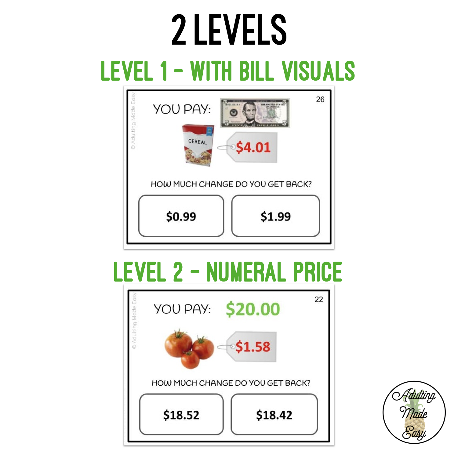 Practice real-world money skills with this set of 60 differentiated consumer math task cards (4 per page) using real-life images. Students work on making change with visual supports and subtraction problems that include 1-, 2-, and 3-digit numbers, as well as dollars and cents. Each card features a limited answer field of 2 choices, making it ideal for life skills, vocational training, and special education settings.