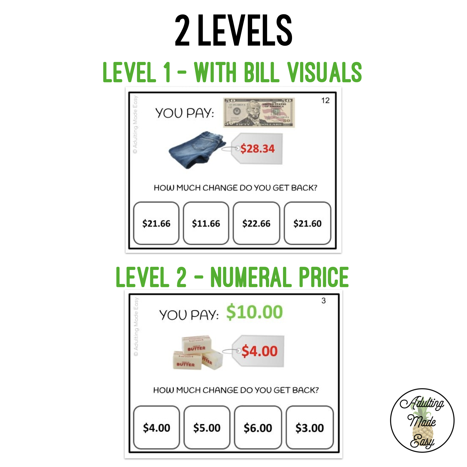 60 Subtraction Money Consumer Math Task Cards (4 per page) with real images. Differentiated life skills and vocation skills of making change with money visuals and different levels of numbers (1, 2, 3 digits, dollars and cents). Answer field of 4.