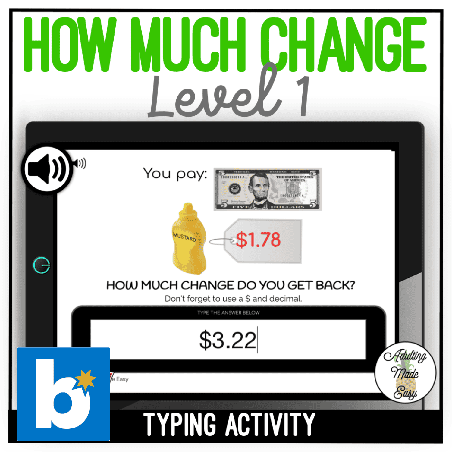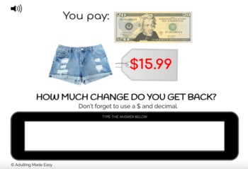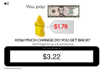Subtraction Money Consumer Math to determine making change after a transaction digital interactive questions with immediate positive reinforcement for correct answers, redirection for incorrect answers