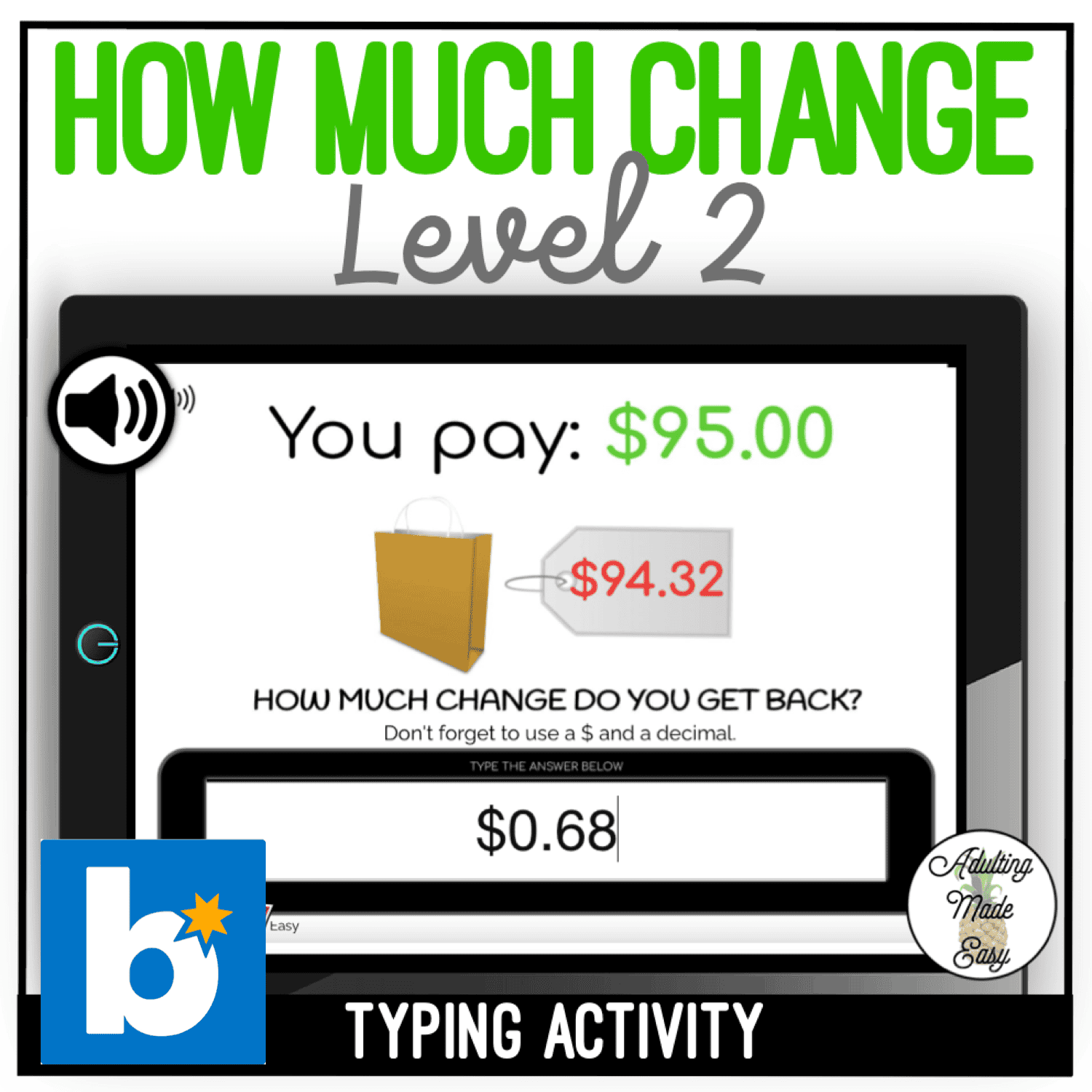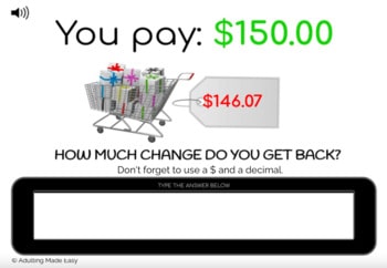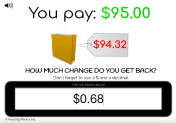 Subtraction Money Consumer Math to determine how much change do you get back after a transaction digital interactive questions with immediate positive reinforcement for correct answers, redirection for incorrect answers