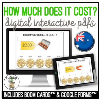 NO PREP, PAPERLESS, digital interactive PDF activity BUNDLE to practice How Much Does It Cost? (AUS MONEY) Task Cards up to $5 AUD, great for touching and counting. Age appropriate engaging life skills activity for special education. Distance or remote learning