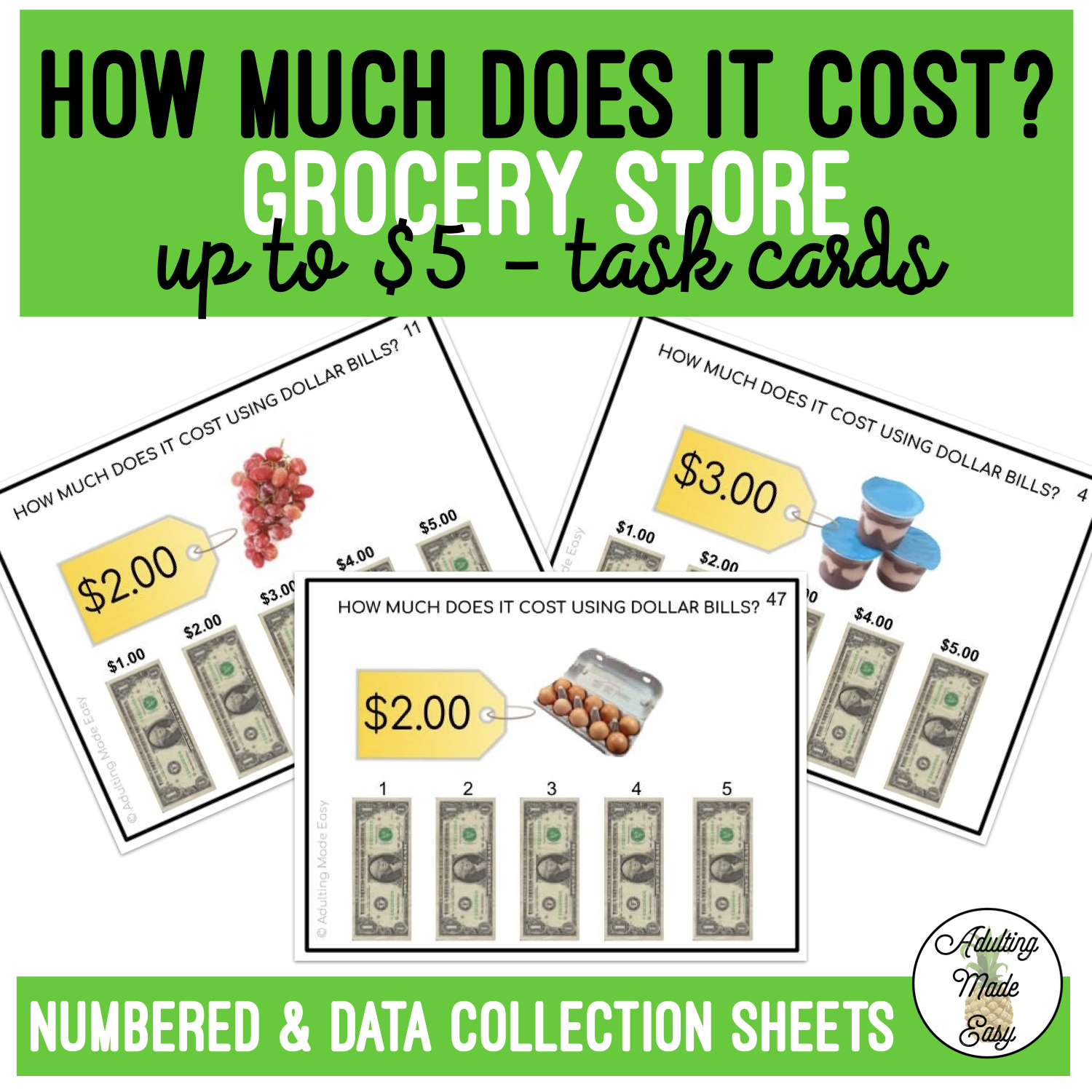 Introduce students to real-world money skills with these grocery store-themed price identification task cards! This age-appropriate activity helps students practice recognizing prices, touching money, and counting dollar bills using engaging, visual supports. Perfect for special education, life skills classrooms, and visual learners developing foundational consumer math skills.