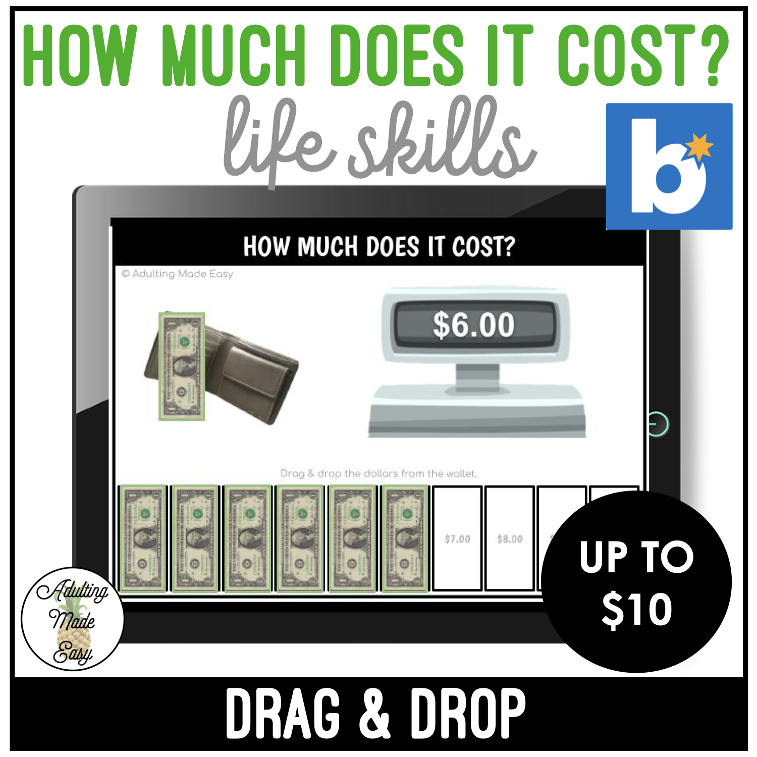 Digital Independent Work task box activity where students practice identifying how much items cost and then counting dollar bills to pay for the item. Price tags up to $10.00.