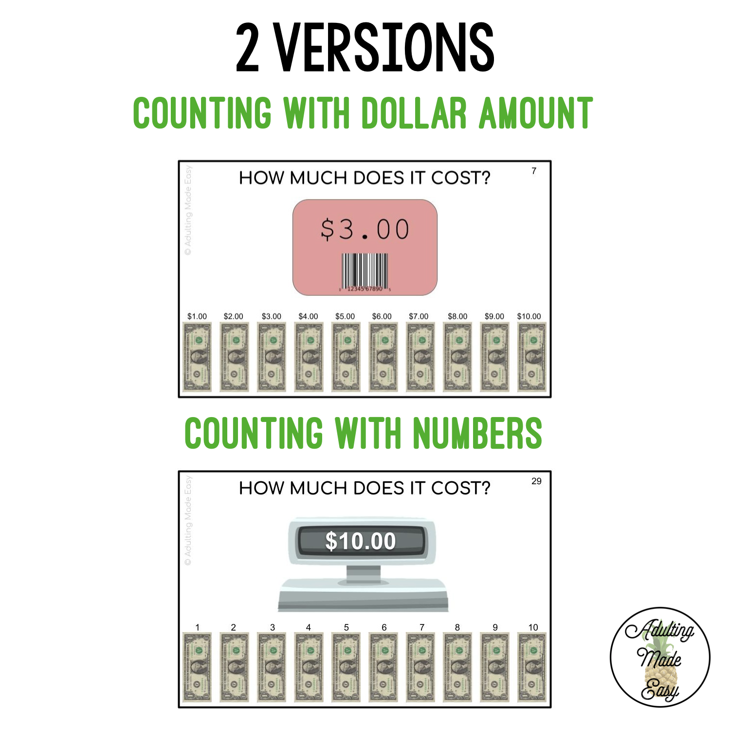 How Much Does It Cost Using Dollar Bills? Task Cards Students can practice touching and counting dollar bills up to $10 according to the cash register or price tag. Age appropriate life skills task bin consumer math activity for secondary special education students!